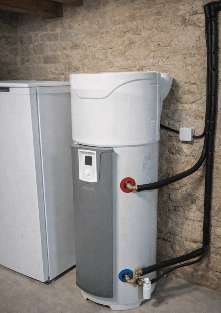 En pratique, un chauffe-eau thermodynamique à air extérieur capte les calories de l’air extérieur via des gaines ; une pompe à chaleur intégrée au ballon chauffe puis assure la production et stockage de l’eau chaude sanitaire. La prise d’air est séparée du ballon, garantissant l’indépendance vis-à-vis de l’air intérieur et un fonctionnement stable quelle que soit la configuration du logement.
